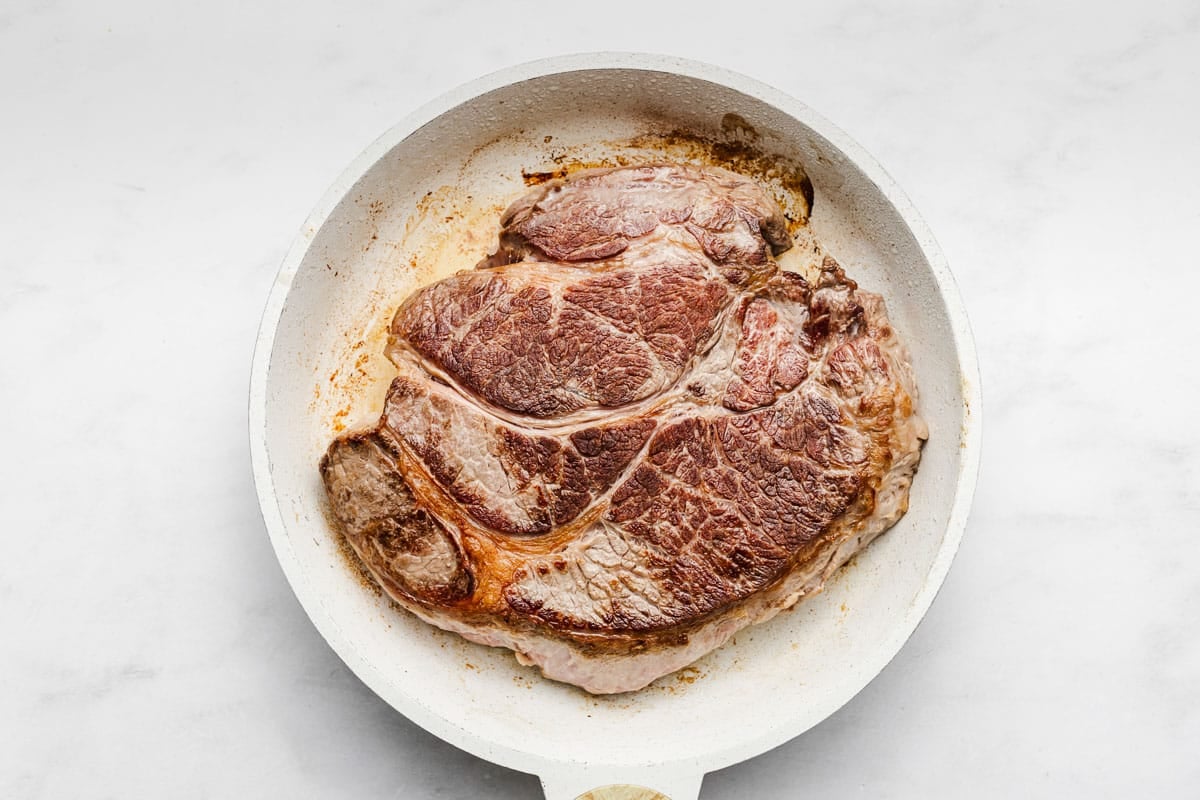 - Add oil to a skillet and heat to high heat. Once oil is hot, place your pot roast in the skillet and brown on both sides. Approximately 3-4 minutes per side.