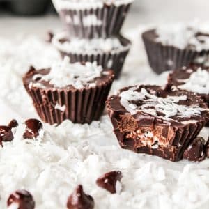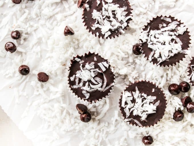 You’re only about twenty minutes and three ingredients away from enjoying these easy dark chocolate coconut cups. No baking required! Just melt the chocolate with coconut oil, layer with coconut flakes, and freeze!