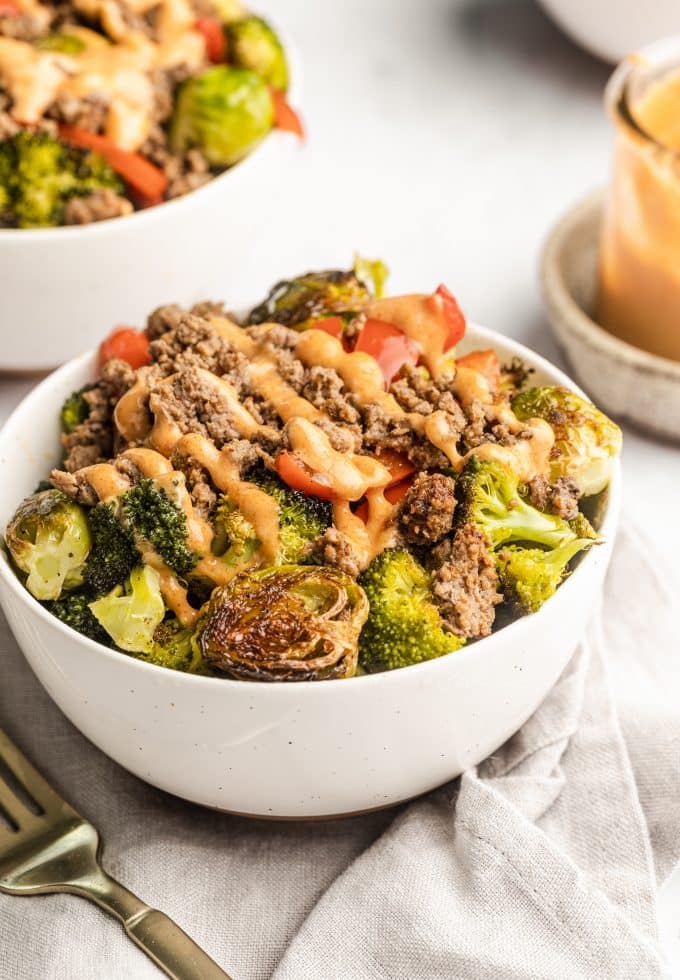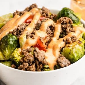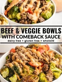 - To assemble, divide all roasted veggies into bowls. Top with cooked ground beef and Comeback Sauce. You’re ready to eat!