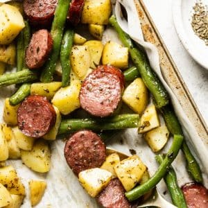 Dinner is served in only 30 minutes with this easy sheet pan meal! Sausage, potatoes, and green beans roast together in this quick meal the whole family will love.