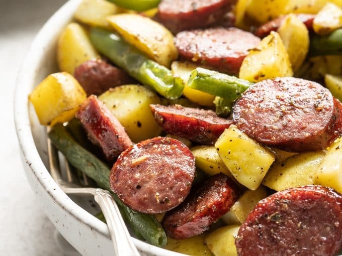 The prep is minimal. The most time intensive thing you’ll have to do is chop your potatoes and slice the sausage. Talk about simple, right?