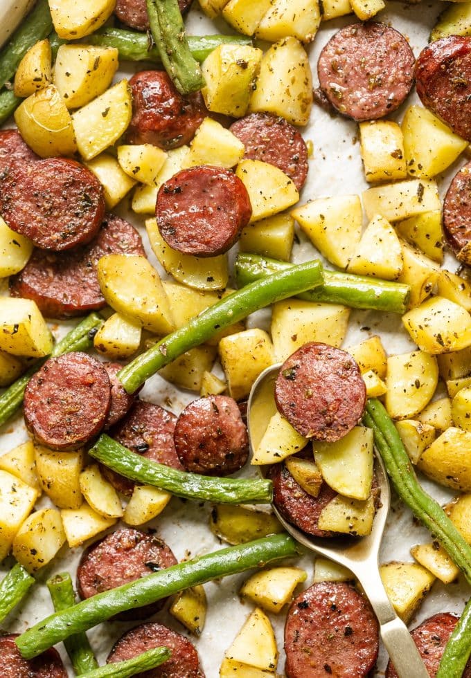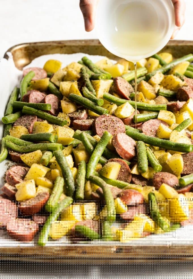- Spread green beans, potatoes, and sausage on the baking sheet. They do not need to be kept separate. Drizzle with olive oil. Sprinkle with salt, pepper, garlic powder, basil, and oregano. Stir so everything is well seasoned. Spread sausage and veggies in a single layer after stirring.