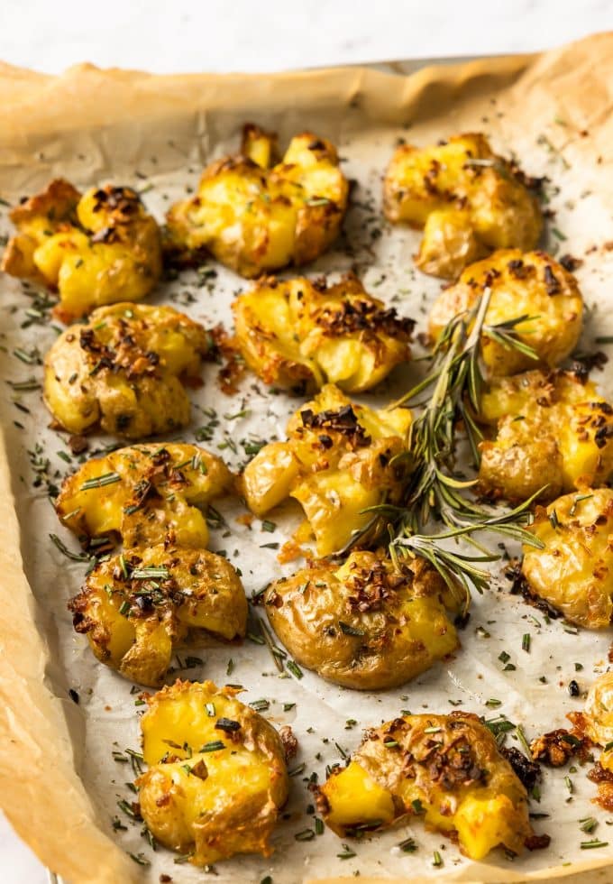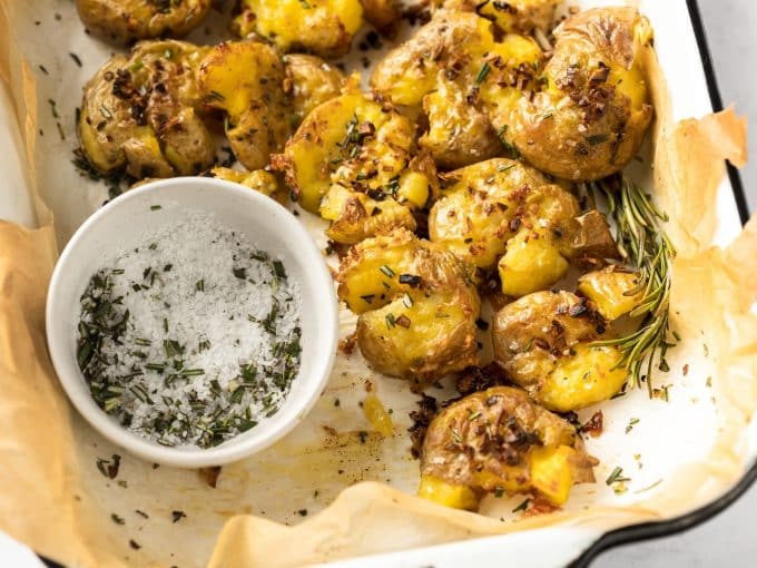 These Rosemary Garlic Smashed Potatoes have a crispy outside with a soft center. They’re so garlicky and good you won’t want to stop devouring them!