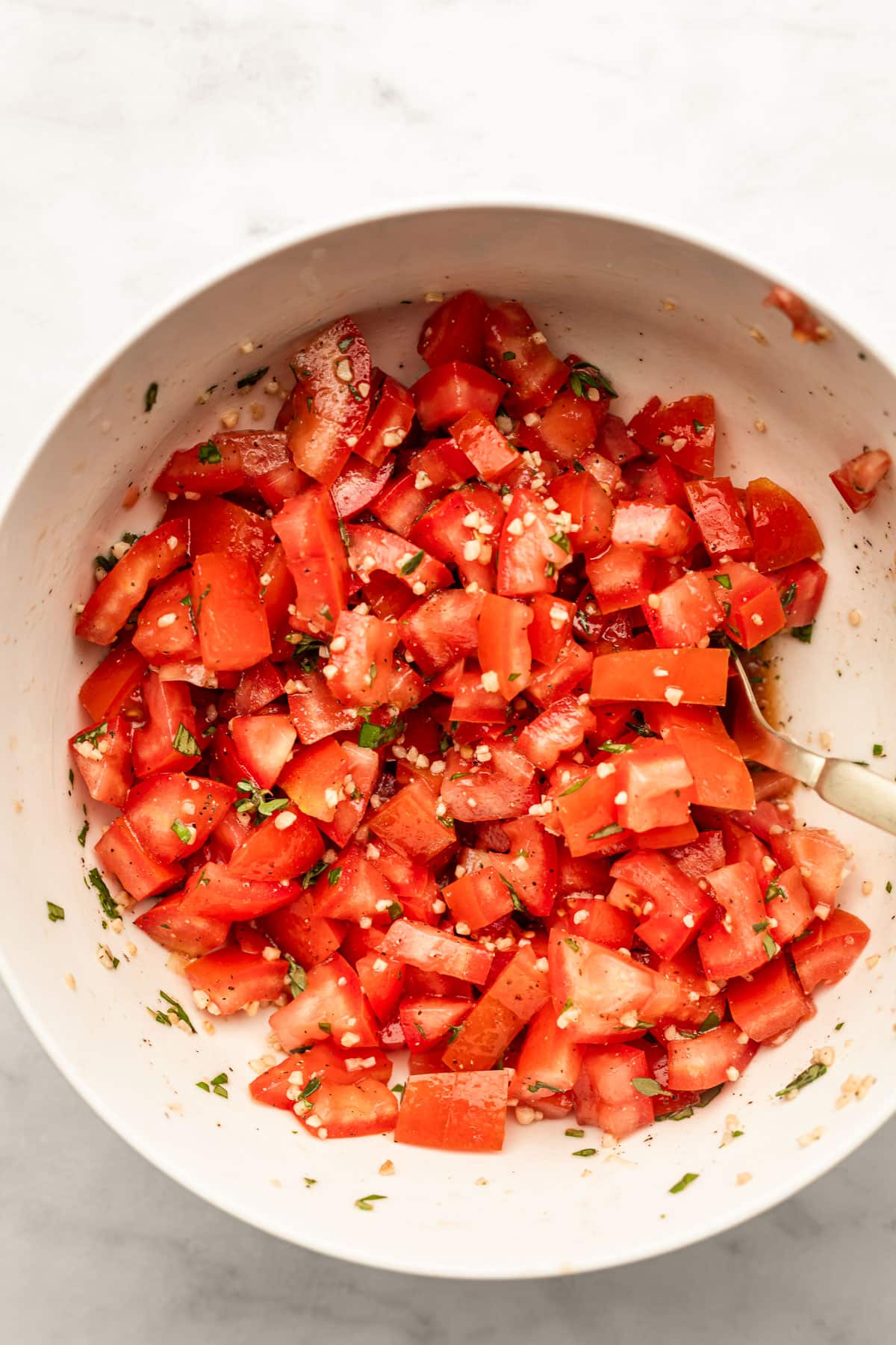 Recently we were eating at a restaurant that served a complimentary bruschetta appetizer to all of it’s guests. I’m not usually someone who orders it but this one smelled strongly of garlic. Since garlic is my love language I couldn’t say no. It was really out of this world good. Naturally it got me thinking about how to incorporate those flavors in a better for you dish. So let’s turn it into an entree, shall we?
