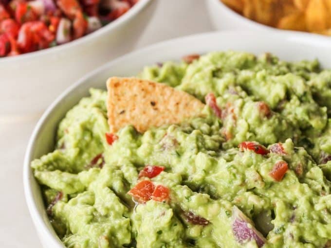 Today we make this guacamole almost every week. Sometimes I serve it up as a dip but often I just add it to other dishes!