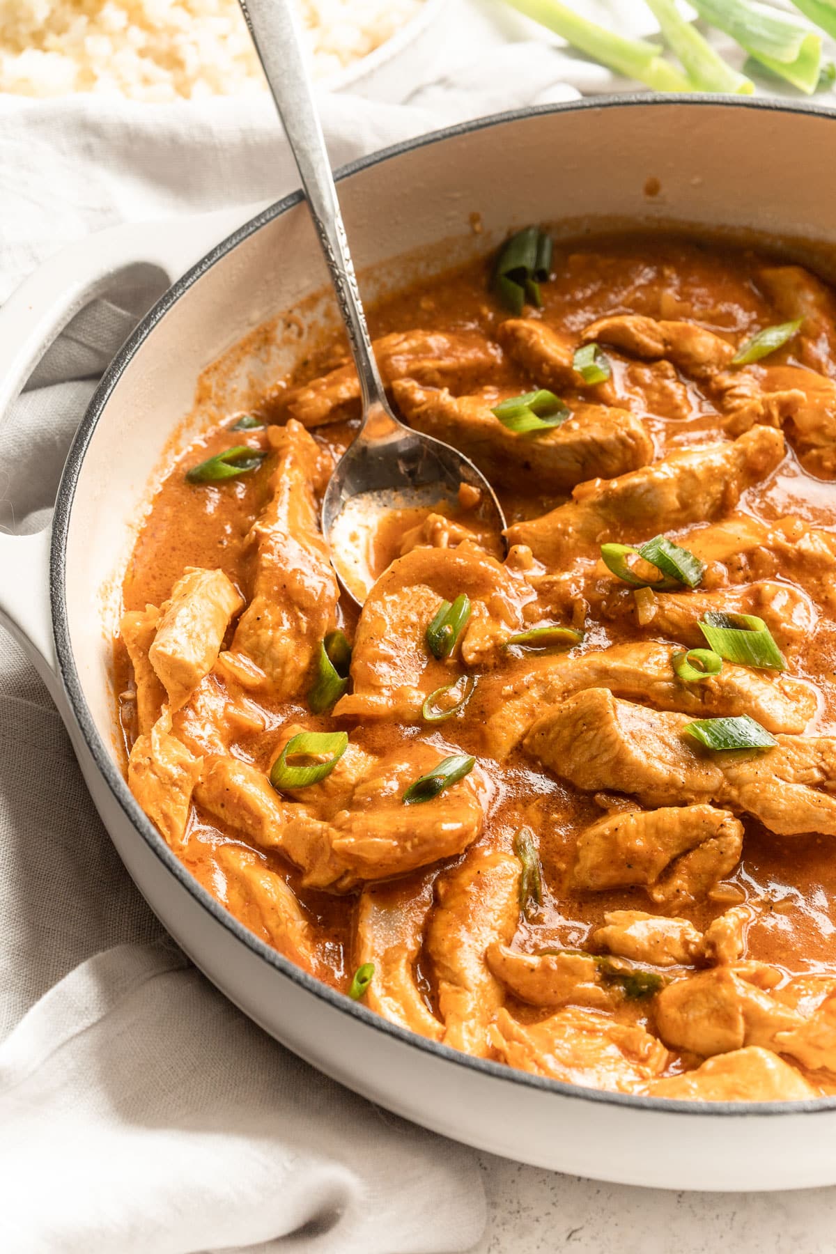 This chicken does have some heat thanks to the cayenne pepper. I think a great curry needs to be a bit spicy but you can reduce the amount of cayenne pepper you use from 1/2 tsp to 1/4 tsp if you’d like to make this mild.