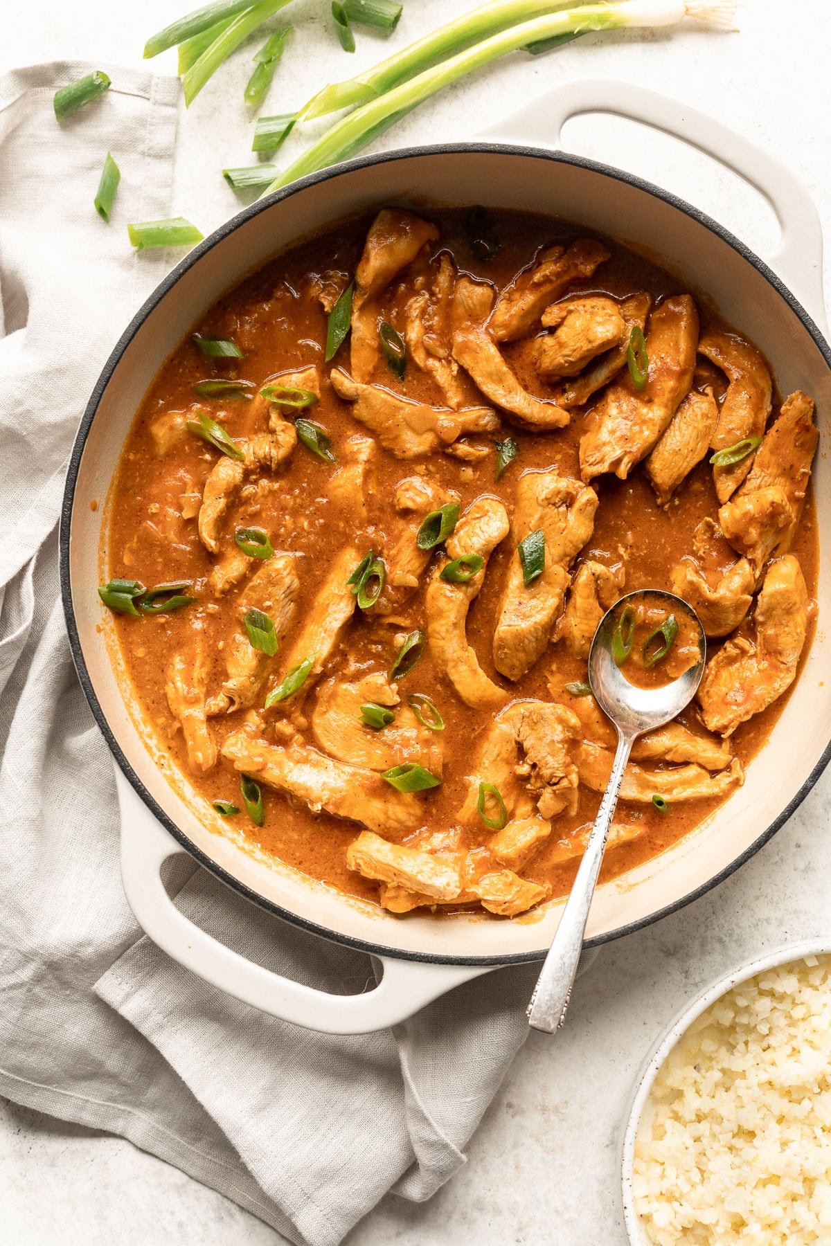 I get this question often but you really do need to stick with canned unsweetened coconut milk. Don’t even use the coconut milk that comes in a box or in the refrigerated section. Canned coconut milk is thick and not as watered down as other milks. That’s important for thickening our sauce!