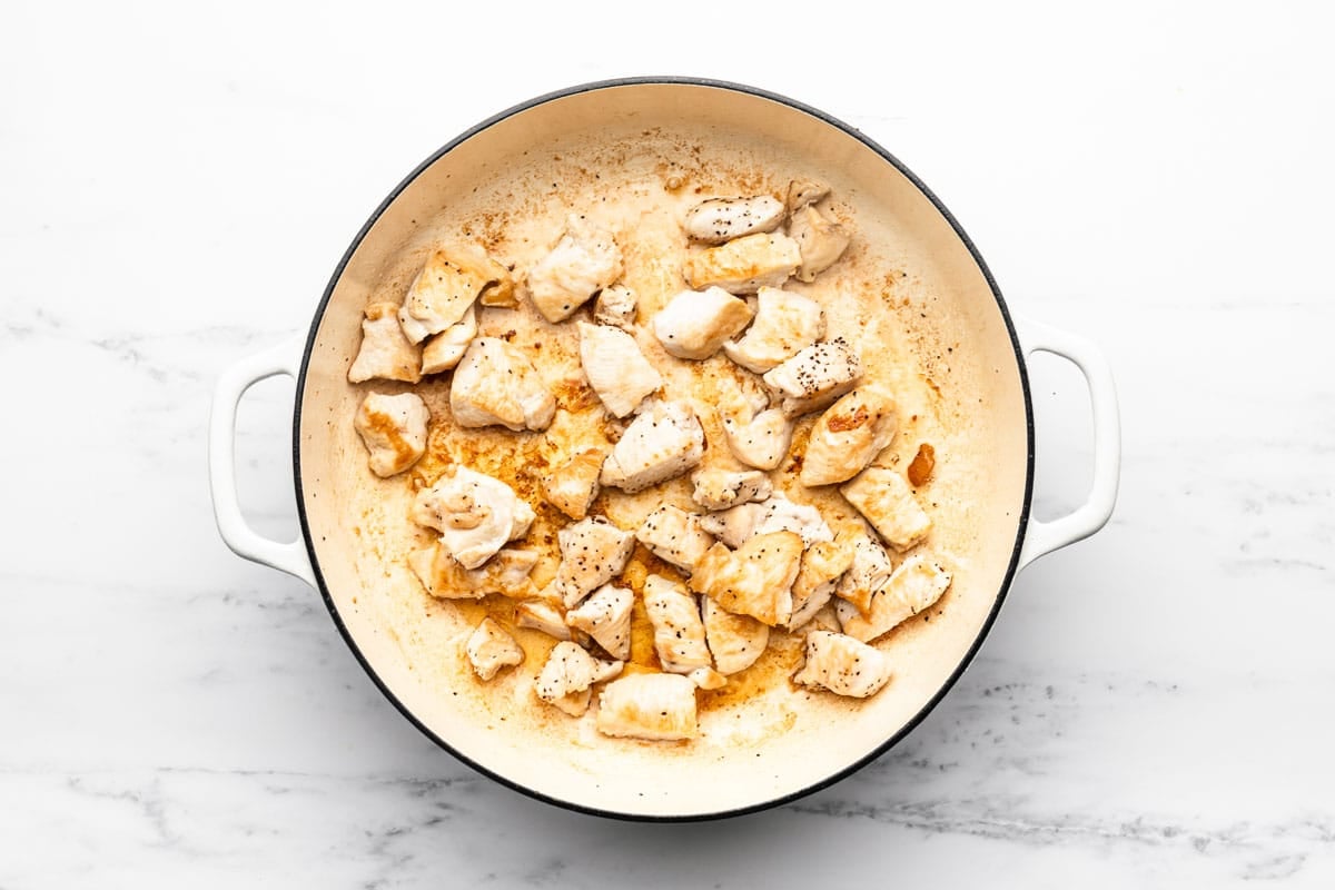 - Add oil to a large skillet. Heat on medium-high. Once oil is hot, add your chicken pieces. Salt and pepper. Sautรฉ for 3 to 4 minutes uncovered, flipping occasionally. Chicken should have some browning.ย Remove from skillet and set aside.