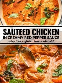 Sautéed Chicken in Creamy Red Pepper Sauce is so incredibly flavorful but simple. Serve it over noodles, zoodles, spaghetti squash or with roasted veggies!
