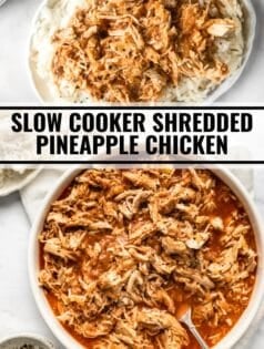 This Slow Cooker Shredded Pineapple Chicken is a life saver when you know your day or evening is going to be a little crazy. If you can plan ahead all you need to do is throw the ingredients in the slow cooker. When dinner time hits it’s all done and ready to eat!