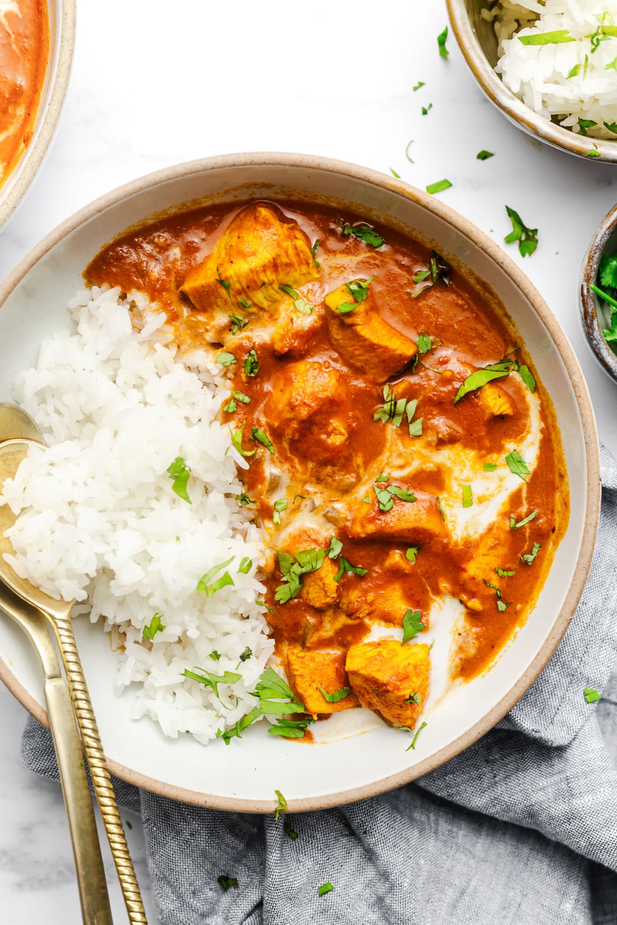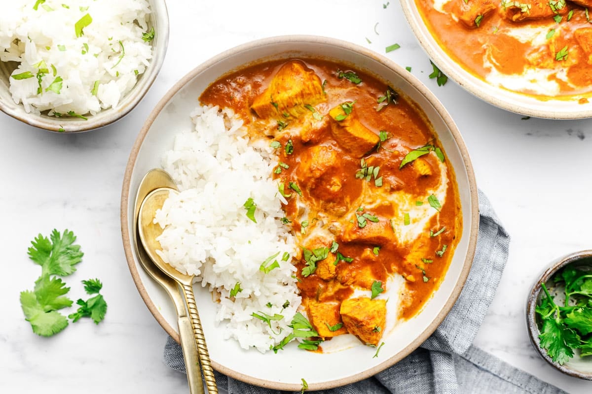 Scoop 1/2 cup of the solidified cream from the top of a can of coconut milk or coconut cream. Stir into your butter chicken. Garnish with chopped cilantro and a drizzle of coconut milk (optional) when serving. Ladle over white rice or cauliflower rice to take full advantage of the creamy sauce.