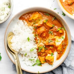 Ladle over white rice, brown rice, or basmati rice. If low carb opt for cauliflower rice. This recipe makes a lot of sauce and using naan bread to sop it all up is one of the very best things on earth. Garnish with chopped cilantro and a drizzle of coconut milk (optional) when serving. If you’re wanting a vegetable side I recommend my Air Fryer Frozen Green Beans, Garlic Green Beans, or Easy Roasted Broccoli.