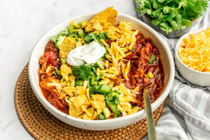 Add everything to your slow cooker. Cover. Cook for 6 to 8 hours on low or 4 hours on high. Youโll know itโs done when chicken shreds easily with a fork. Shred chicken and place back in the soup. Ladle into bowls and add desired toppings.