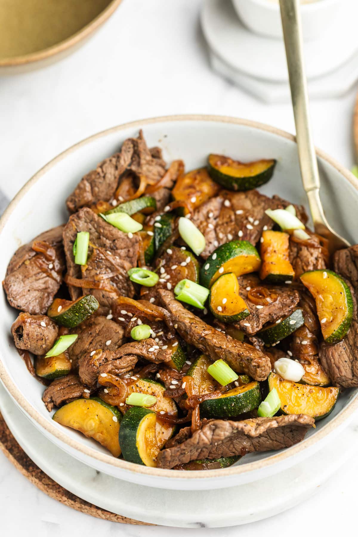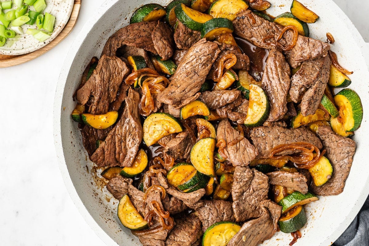 To make this dish first brown the steak first in a large skillet and then set it aside. It’s going to cook fast since we’ve thinly sliced it. Then add your zucchini and thin strips of onion to the skillet to get them tender. Season. Incorporate the coconut aminos, rice vinegar, and seasonings. Get ready to eat!
