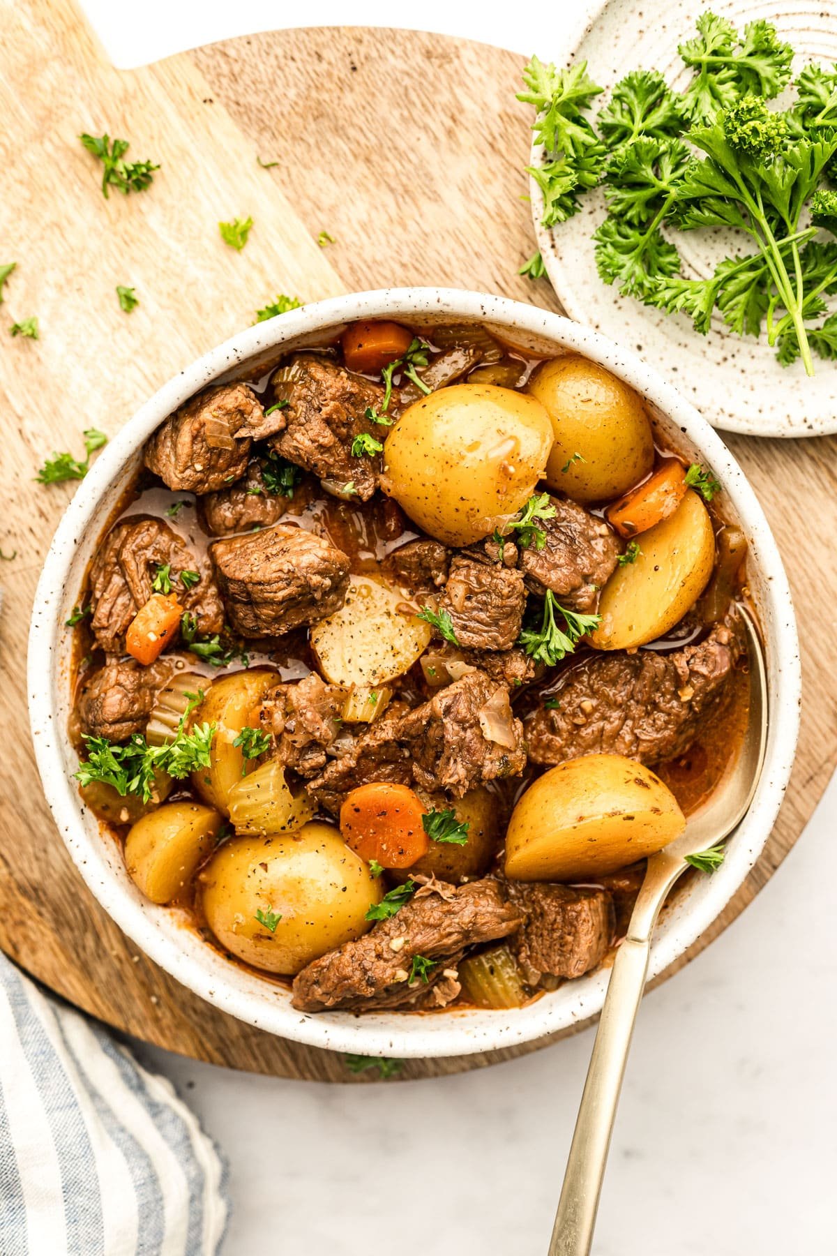 I top my finished stew with chopped fresh herbs because I’m always pro fresh herbs wherever possible and literally always have some in the fridge I want to use up before it goes bad. You can always skip that if you’re not so inclined.