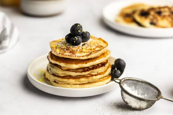 Make breakfast extra special with these fluffy lemon blueberry pancakes! Top with maple syrup or powdered sugar, blueberries, and lemon zest.