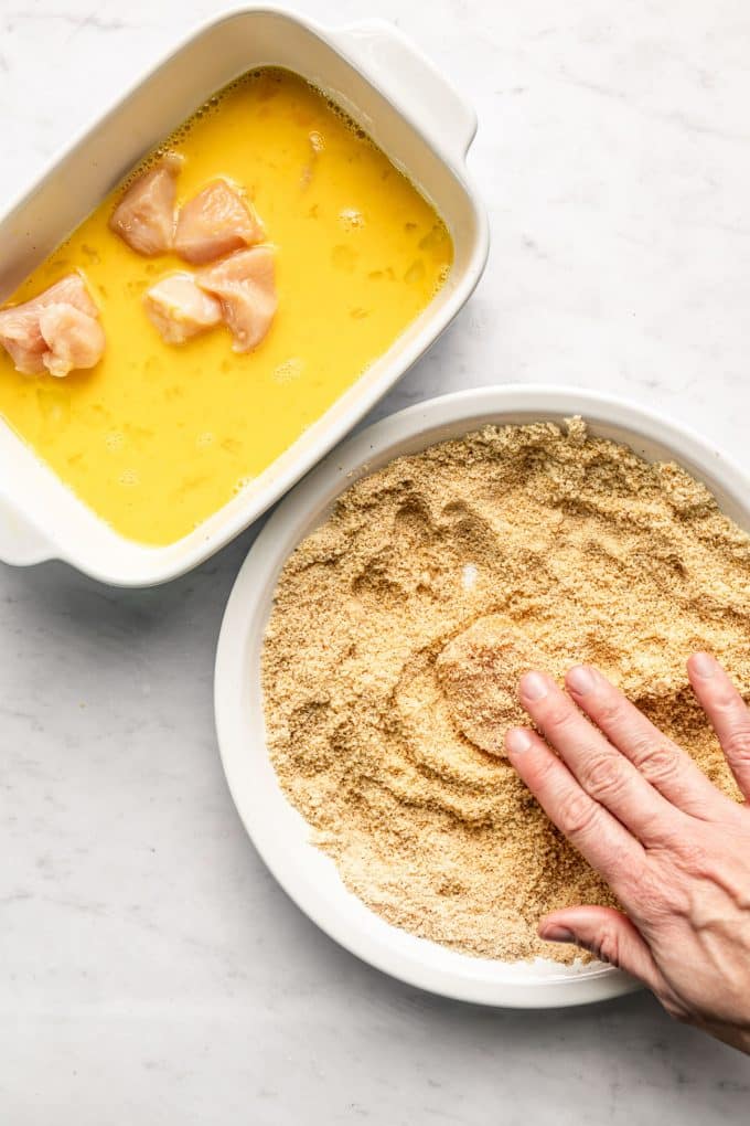 - Make sure you drip off any excess egg wash before dipping your nuggets into the breading mixture. This is an important step that you don’t want to skip. Otherwise the egg will end up in the breading, causing it to clump together.