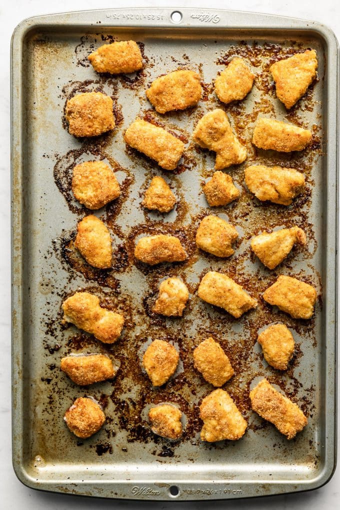 I’m using simple seasonings to make these nuggets flavorful but still perfect for young children. Adults will want them too. Oh I sure do. The first time I tested this recipe I mowed through half the sheet pan myself. That’s not a serving size, friends. I have no regrets.