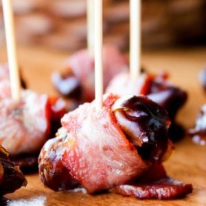 It’s easy appetizer time! A few years ago I made some amazing dates wrapped in bacon and stuffed with a faux ricotta cheese. They were yummy but holy cow, friends, they took a lot of work and dirtied up a lot of my dishes. This mama doesn’t have time for that. That motivated me to work on a much simpler version.