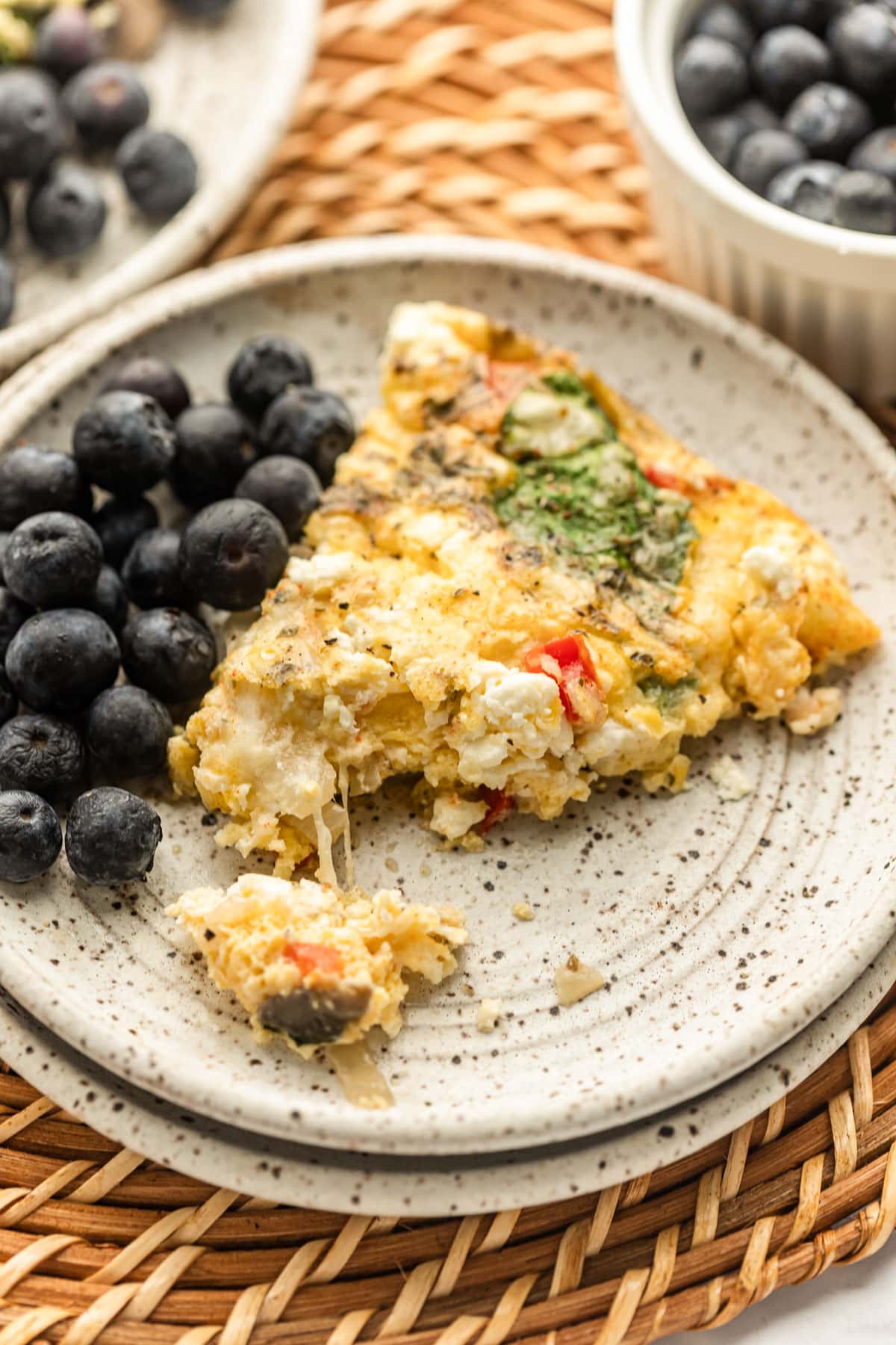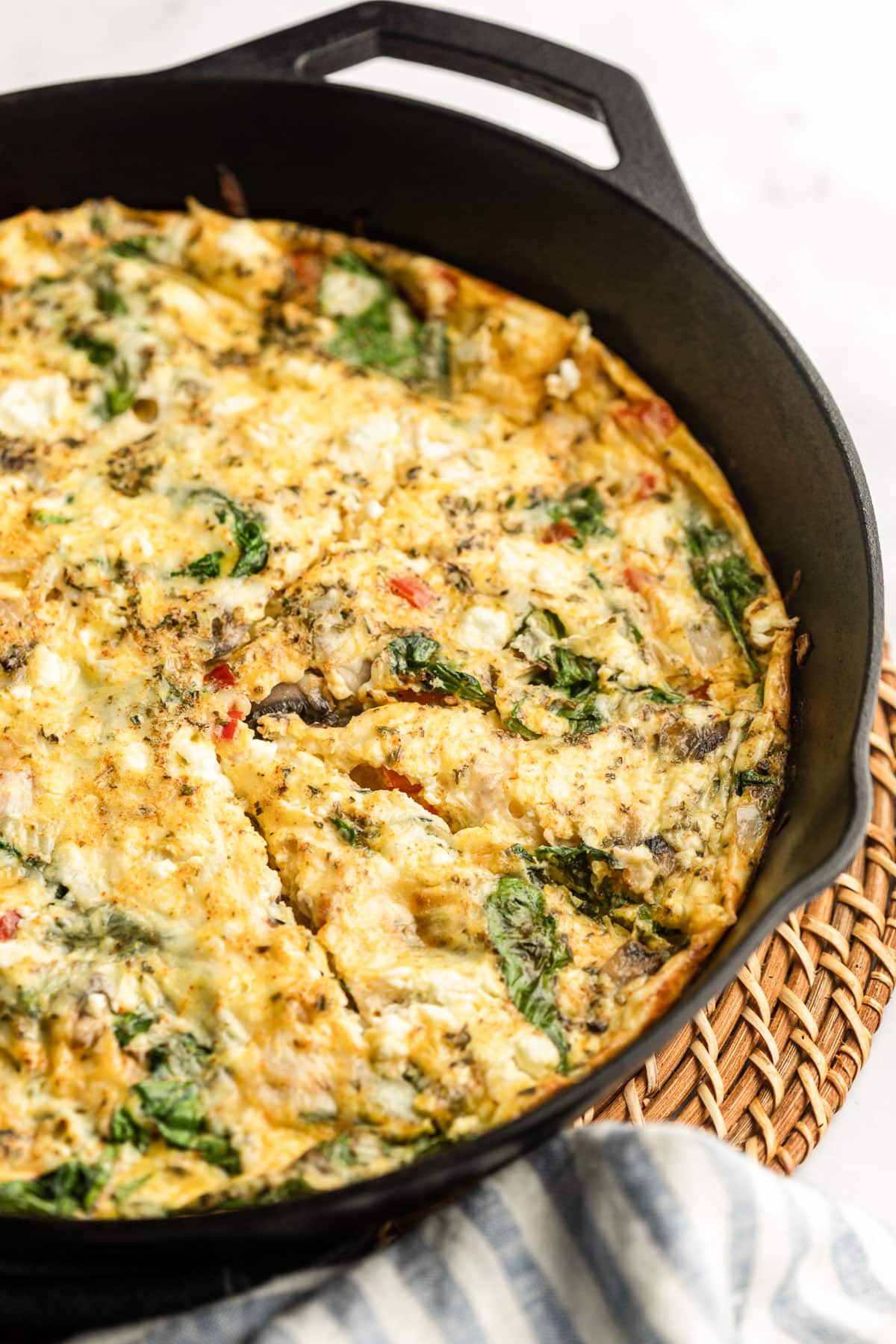 This Vegetable Frittata includes two types of cheese: mozzarella for the melt we want and feta for saltiness and a great texture contrast. I just love these two together. We’re also adding onion, bell pepper, mushrooms, and spinach to really fill this entree out. The end result is full of flavor and so beautiful.