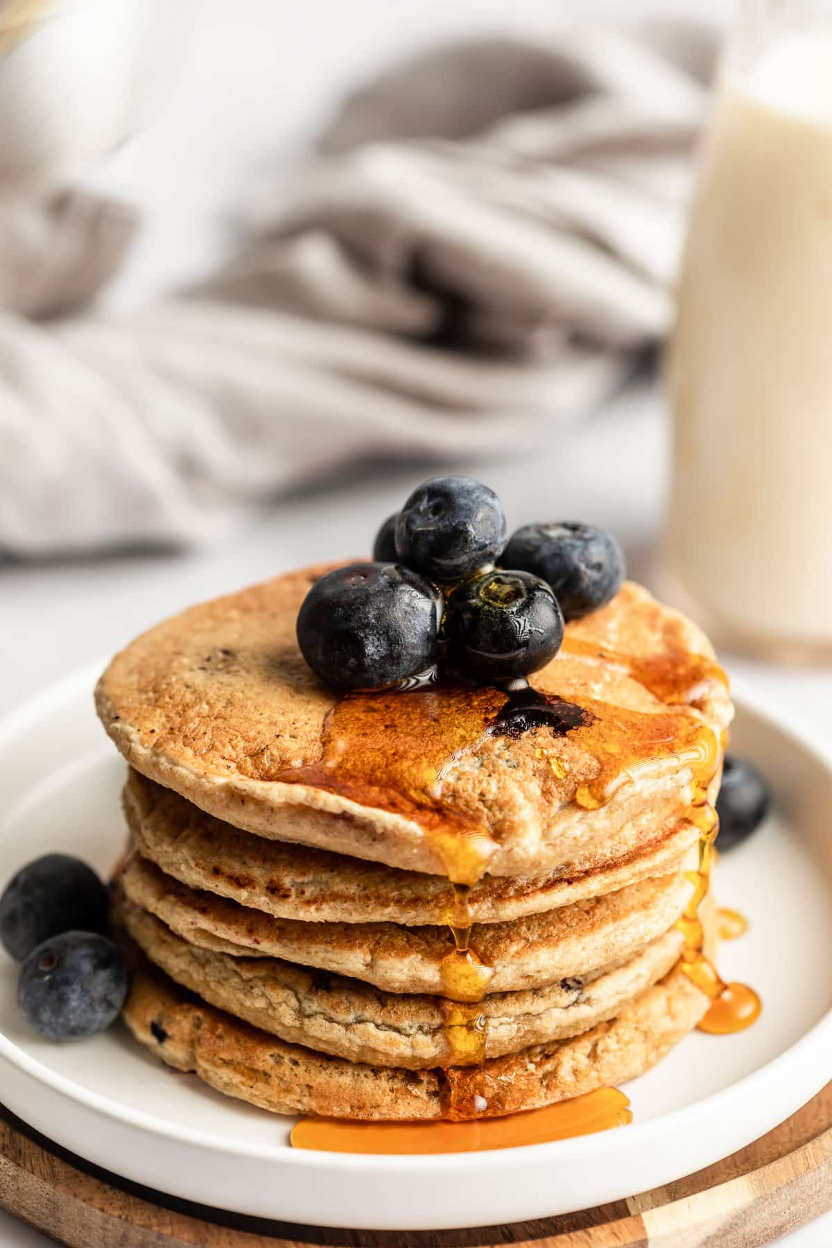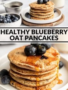 These are soft, perhaps not quite as fluffy as if you’d used white flour but close! And the flavor is truly everything you want in a blueberry pancake. I doubt someone will even be able to notice that they’re made with oats.