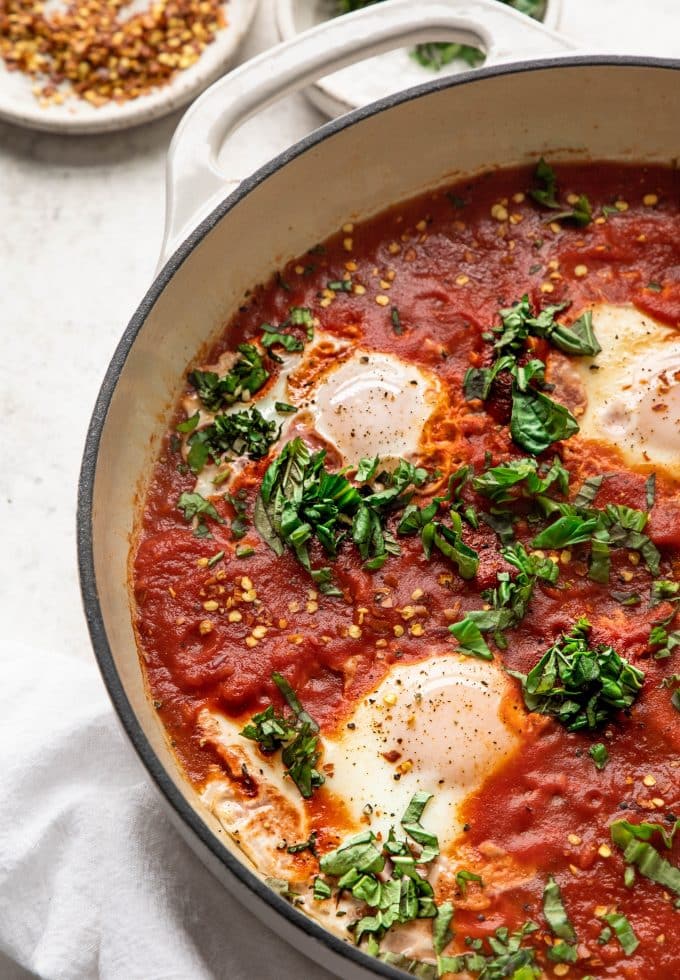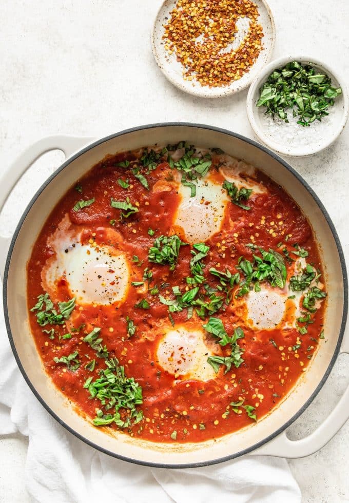 Poached eggs are cooked by adding them to simmering water. The eggs in this dish actually cook in our sauce as it simmers. The end result is firm whites (but not too firm) with runny yolks.