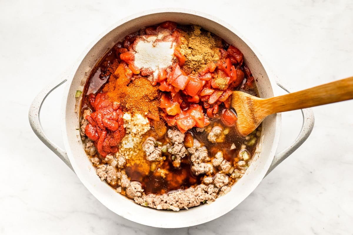 - Once your ground beef is cooked it's time to add the other ingredients to the pot. Stir. Cover and let simmer for 20 – 25 minutes.