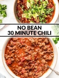 This homemade chili is thick, hearty, and ready in only 30 minutes! It tastes like a classic chili recipe but has no beans. This is one comfort food recipe the entire family will love.