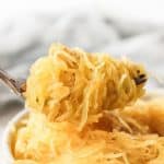 Remove from the oven and set aside. Use a fork to scrape the flesh of the squash and pull the spaghetti-like strands from the skin. Eat as is or top with sauce, meatballs, chicken, vegetables, whatever!